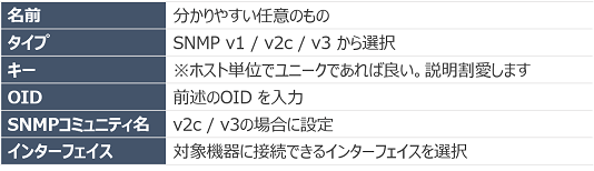 ZabbixからOIDに関する情報を取得する設定については、具体的には以下の項目が挙げられます。